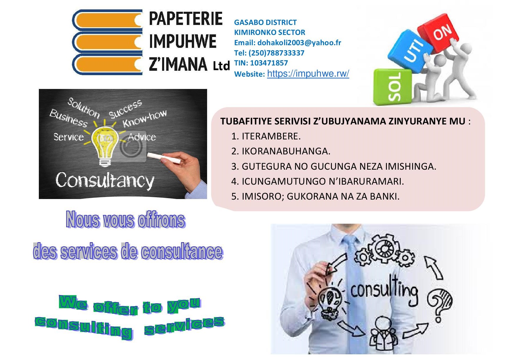 We would like to expand our business line especially in opening our doors to more job seekers so that they may find a place to develop their talents. This is the reason why recently our activities do focus on CONSULTANCY in various areas of life. We have more than 18 activities which need more qualified persons to be engaged in. This is the reason of this business plan which will help us to be more focused in whatever we do. At the end, PAPETERIE IMPUHWE Z’IMANA, Ltd which means “GOD’S MERCY STATIONARY” is a company which from Catholic Church Faith oriented and that respects the needs and expectations of its employees and clients.